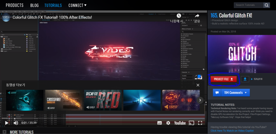 크게 튜토리얼 영상이 나오고 오른쪽에 보시면 타이틀과 간단한 설명 그리고 PROJECT FILE이라고 써 있는 빨간 상자가 보입니다