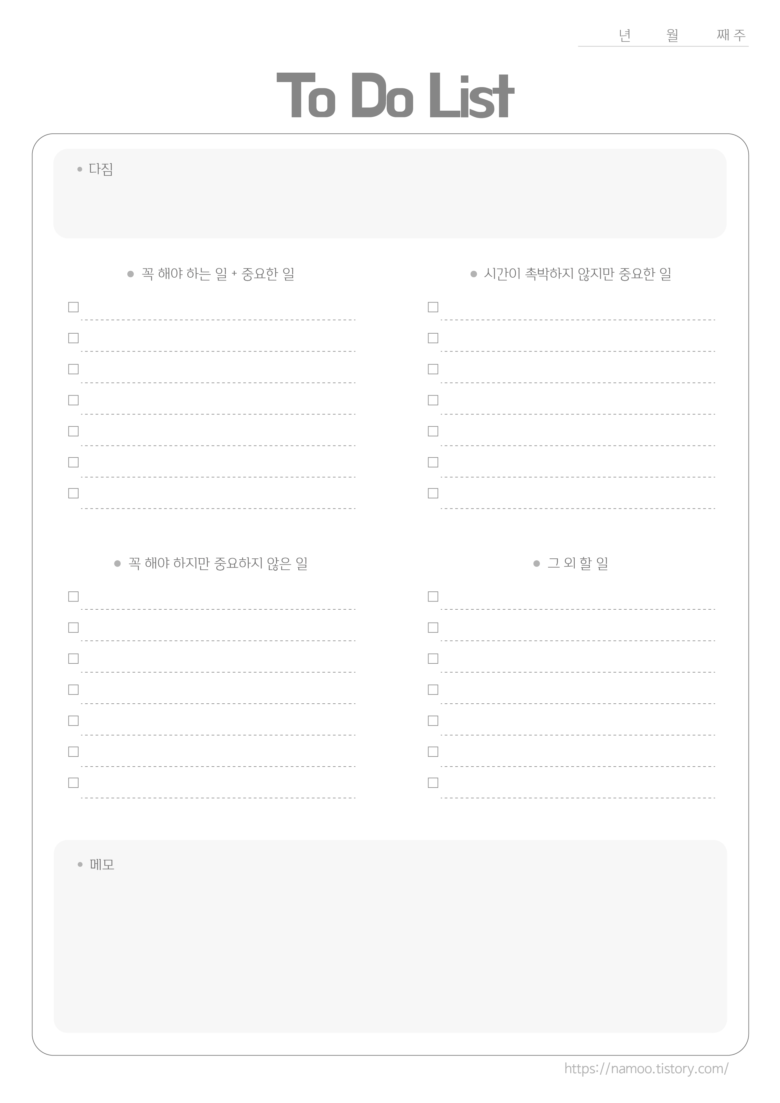 그래서 to do list 쓰는걸 좋아하는데 이건 주간, 월간 으로 쓰면 좋을 것 같아서 만들어봤어요