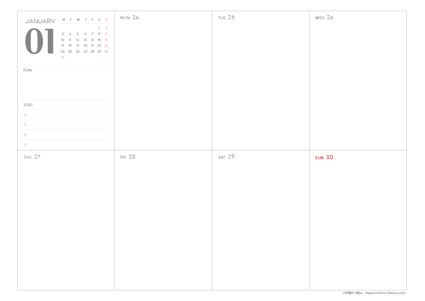 | [나무랭이 - 굿노트 속지 무료 공유] 25. 2022 1월 weekly 다이어리 속지 (0) | 2021.12.29 |